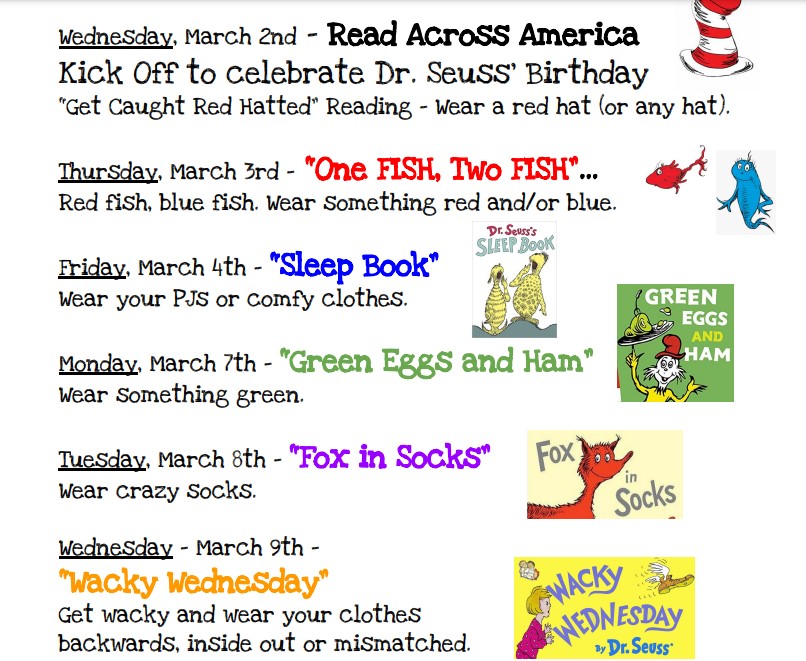~ We will also be celebrating in school with our Dr. Seuss themed Spirit Week. Check the other side for the calendar for the week!